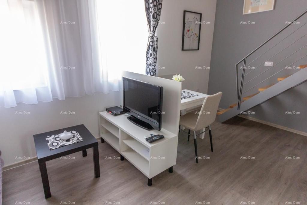 Es besteht aus einem kleinen Flur, einem Badezimmer, einer Küche mit Esszimmer und Wohnzimmer in einem und einem Schlafzimmer auf der Galerie.
