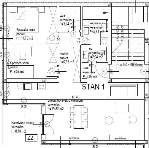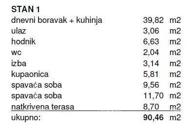 Die Wohnung A1, 90,46 m2, befindet sich im Erdgeschoss des Gebäudes und besteht aus folgenden Räumen: Wohnzimmer + Küche, Flur, Schlafzimmer, WC, Badezimmer, zwei Schlafzimmer, überdachte Terrasse.