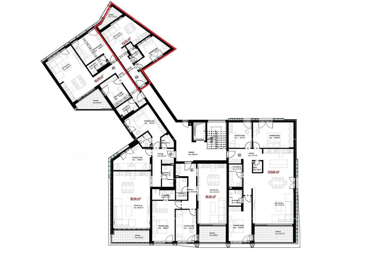 Die Wohnung S9 mit einer Fläche von 42,45 m2 befindet sich im 3. Stock und besteht aus einem Flur, einem Schlafzimmer, einem Badezimmer, einem Wohnzimmer mit Küche und Esszimmer sowie einer Terrasse.
